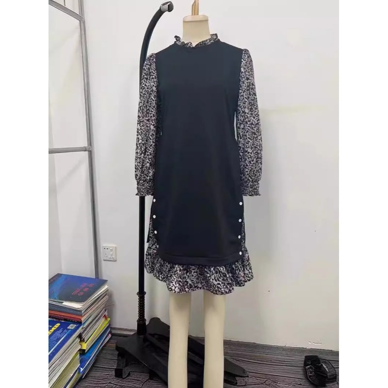 Leopard Kleurblok Hoge Hals Knie-Lengte Jurk