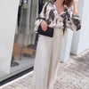 FLATTERENDE BROEK MET WIJDE PIJPEN: De broek heeft een hoge taille en wijde pijpen, wat een flatterend silhouet biedt en comfortabel draagt. De bijpassende print maakt een chique, gecoördineerde look compleet voor dagelijks gebruik.